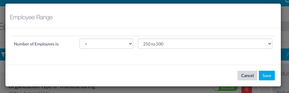- For this example we would like to target companies with more than 500 employees so we chose greater than 250-500: