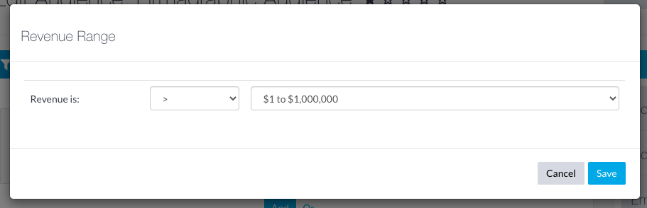 - For this example we would like to target companies with more than $1Million in Revenue: