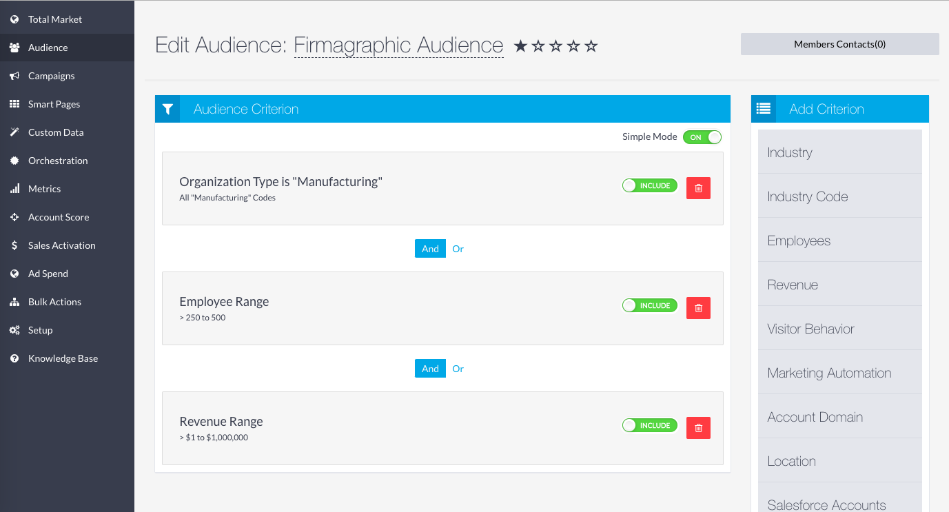 As an example, let's say you would like to target all site visitors within the Manufacturing Industry, with more than 500 employees and over $1M in revenue. Follow the step below to build the audience: