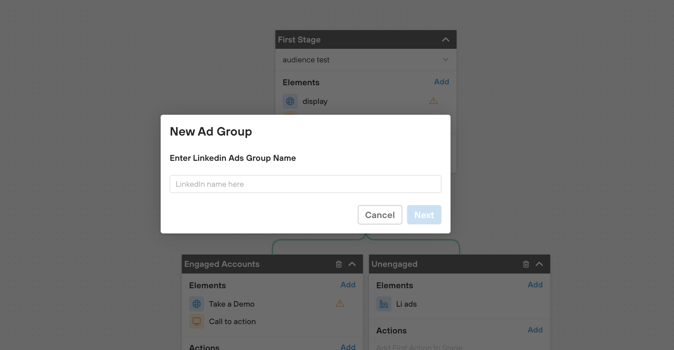 - To add a LinkedIn Matched Audience element to your orchestration, click Add in the elements section of a stage and then select the LinkedIn element.