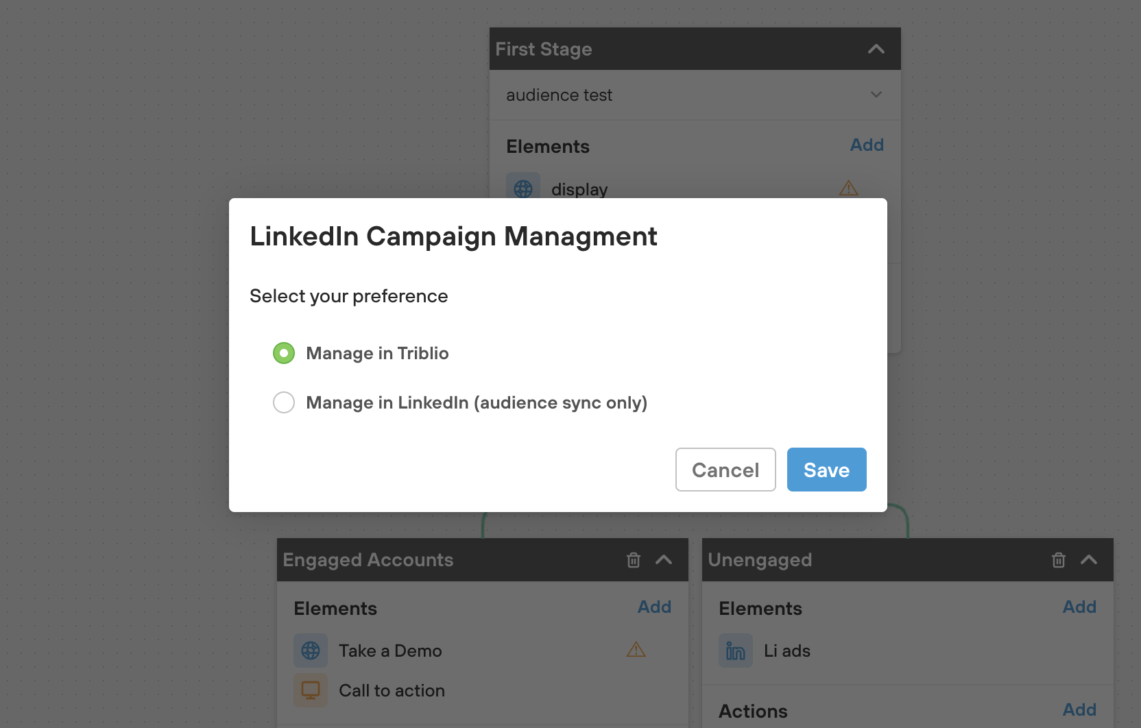 - You will be prompted with two options: Manage in Triblio or Manage in Linkedin (audience sync only)