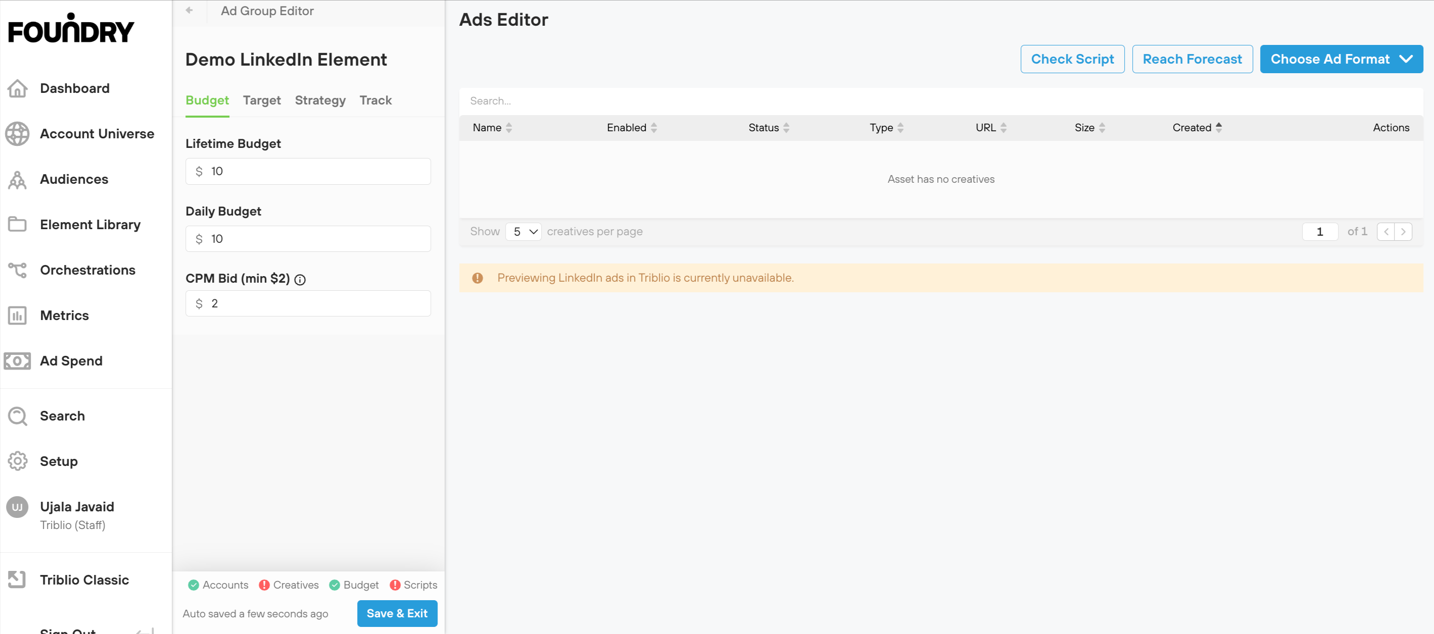 When you activate your orchestration, your LinkedIn Matched Audience element will generate a contact list for all of the accounts in its stage and sync it over to LinkedIn. You should see the matched audience "building" in LinkedIn within an hour or two. Once the segment has finished matching in LinkedIn, you can use it in your LinkedIn campaigns, just like any other audience. Foundry will periodically update this segment in LinkedIn to stay in line with the Orchestration Canvas stage membership as accounts move in and out of the stage.