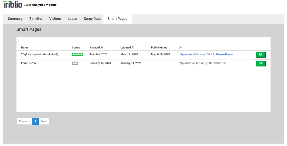 The Smart Pages tab in the ABM Analytics Module lists any Triblio Smart Pages associated with the account. Click the "Edit" button next any Smart Page to add content or modify the page. This could include uploading presentations from calls, linking relevant case studies, or even embedding videos. You can then send account-specific Smart Page URL to the prospect, providing them with a customized experience and enabling you to track their engagement with the content you've added.